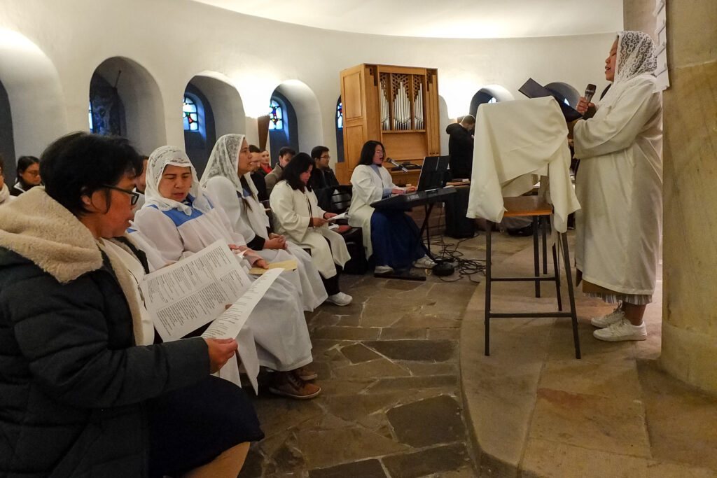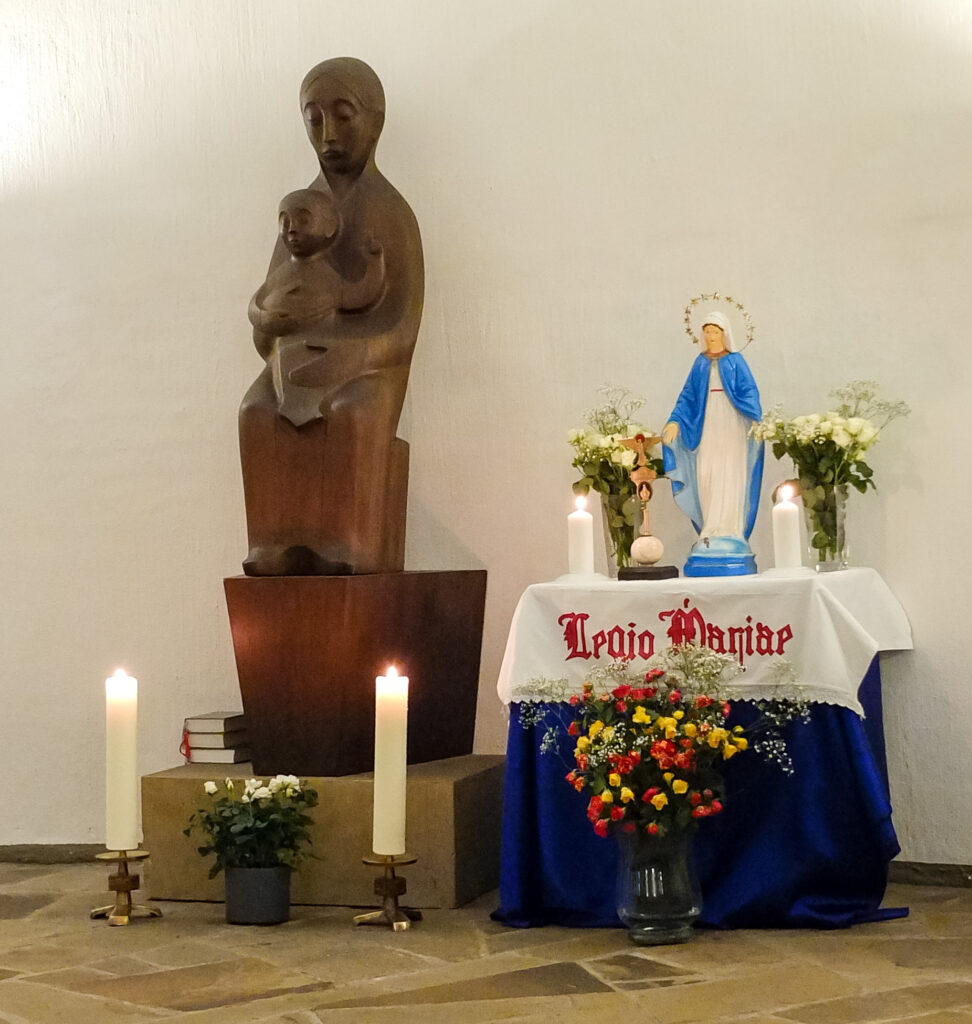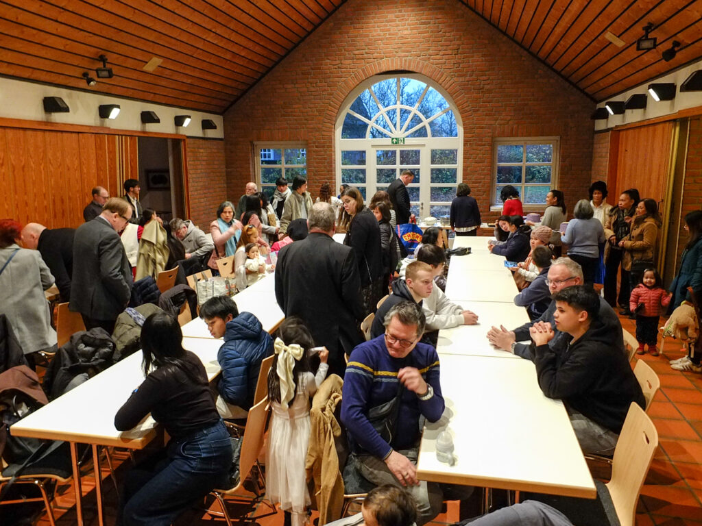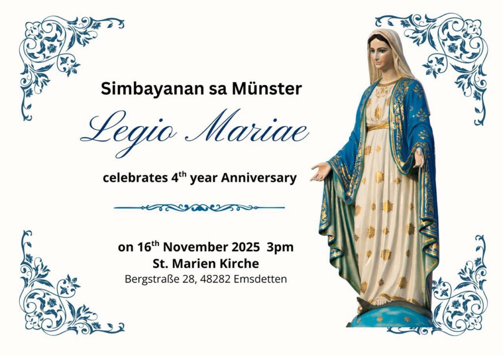 Die Legion Mariens in Emsdetten ist noch ein junges Präsidium – wir berichteten ja schon letztes Jahr davon, wie neue Mitglieder aus der philippinischen Gemeinschaft dort ihr Legionsversprechen abgelegt haben. Bei der Feier zum 4-jährigen Jubiläum kamen somit auch viele aus dem umliegenden Münsterland, die mit der philippinischen Gemeinschaft verbunden sind, und deren Familienangehörige. Die hl. Messe wurde in englischer Sprache gehalten, die zweite Amtssprache auf den Philippinen. Lieder während des Gottesdienstes wurden in Englisch und Filipino gesungen. Neben dem Gedenken für die Gemeinschaft der Legion Mariens wurde auch ein Kind getauft. Anschließend kamen die Teilnehmer zum fröhlichen Beisammensein in das Pfarrheim. Für das leibliche Wohl hatte die philippinische Gemeinschaft reichlich gesorgt.